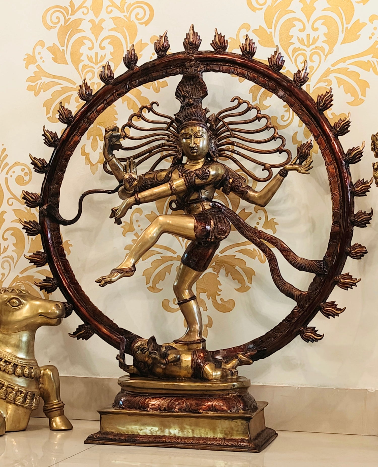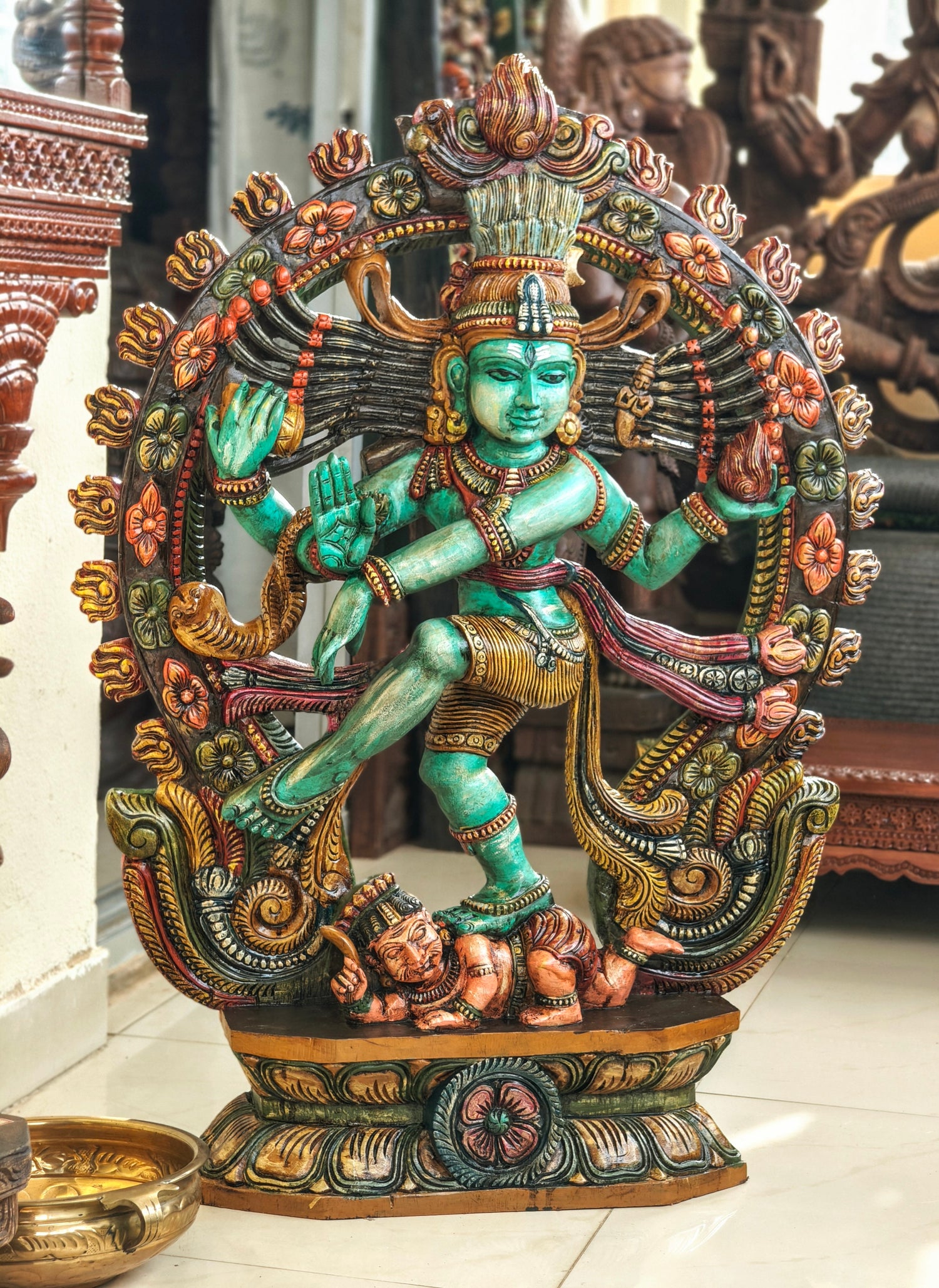 the wooden statue is hand carved in with intricate details with circular frame of flames, symbolizing cycle of creation , preservation.