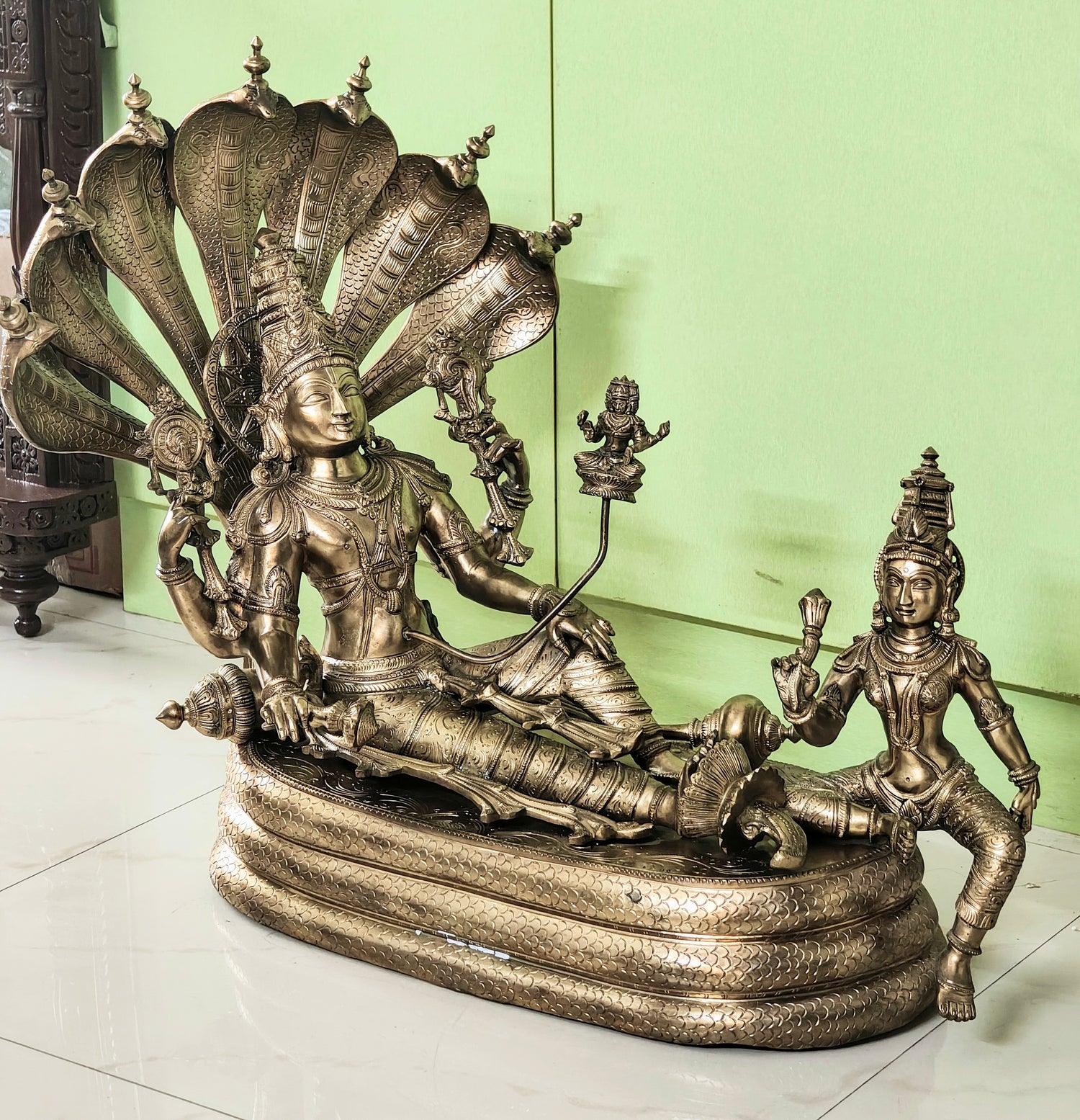 Panchloga statue of Ananth Padmanabhan, lord Vishnu is depicted reclining on Adishesha , the divine serpent with multiple hoods. goddess Lakshmi sitting at his feet showing devotion while lord Brahma emerges from Vishnu navel representing creation.