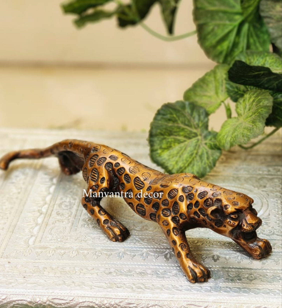 Expertly crafted with a rich brown antique finish, the Jaquar statue stands at 2.5 inches in height, 12 inches in width, and 3 inches in depth. The perfect addition to your home decor, this unique piece adds a touch of elegance and sophistication.