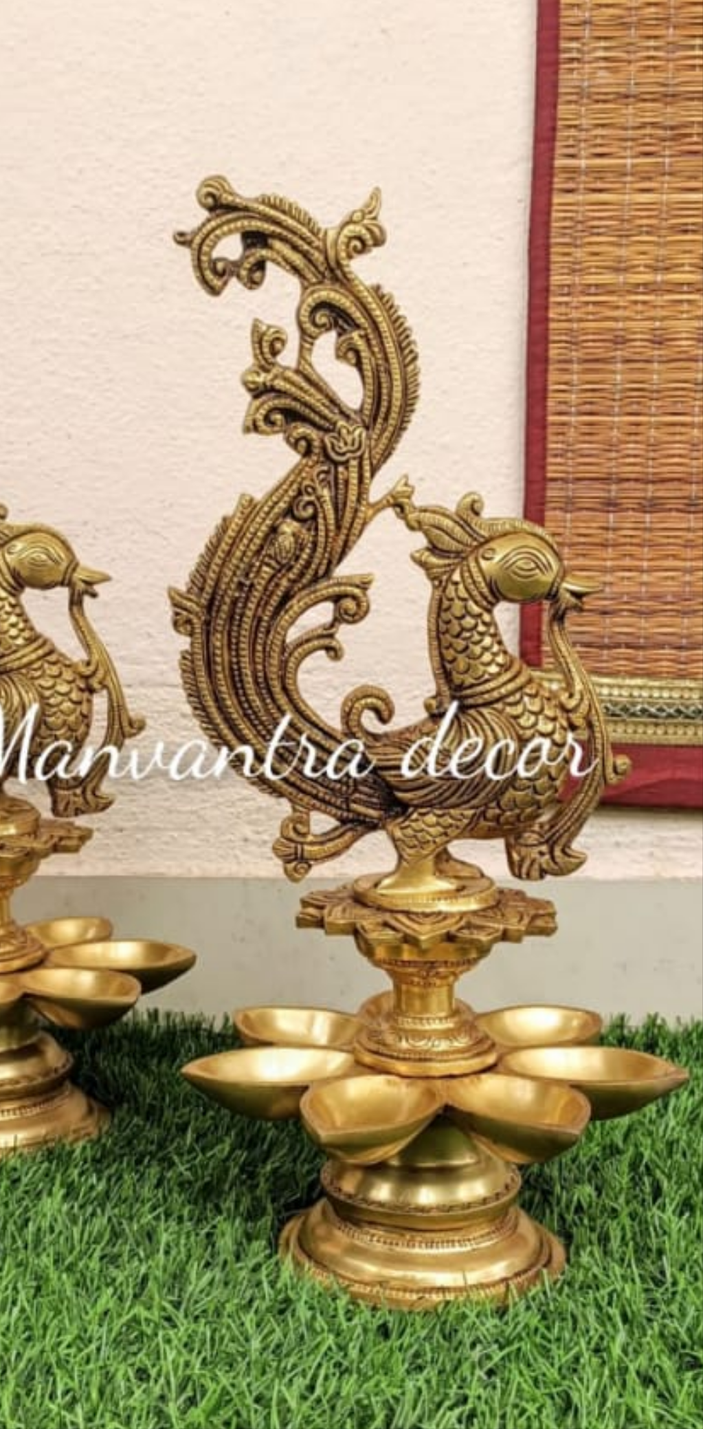 Peacock lamps with 7 big deepas in flower shape. Looks very decorative.