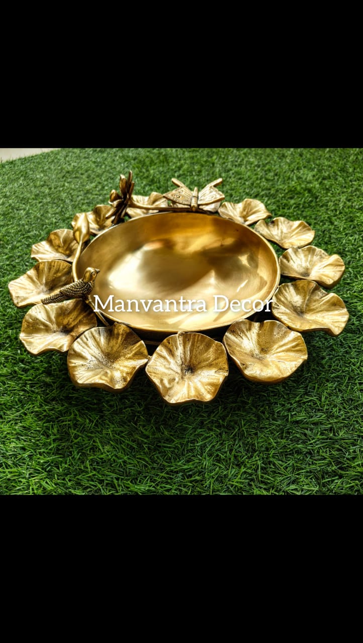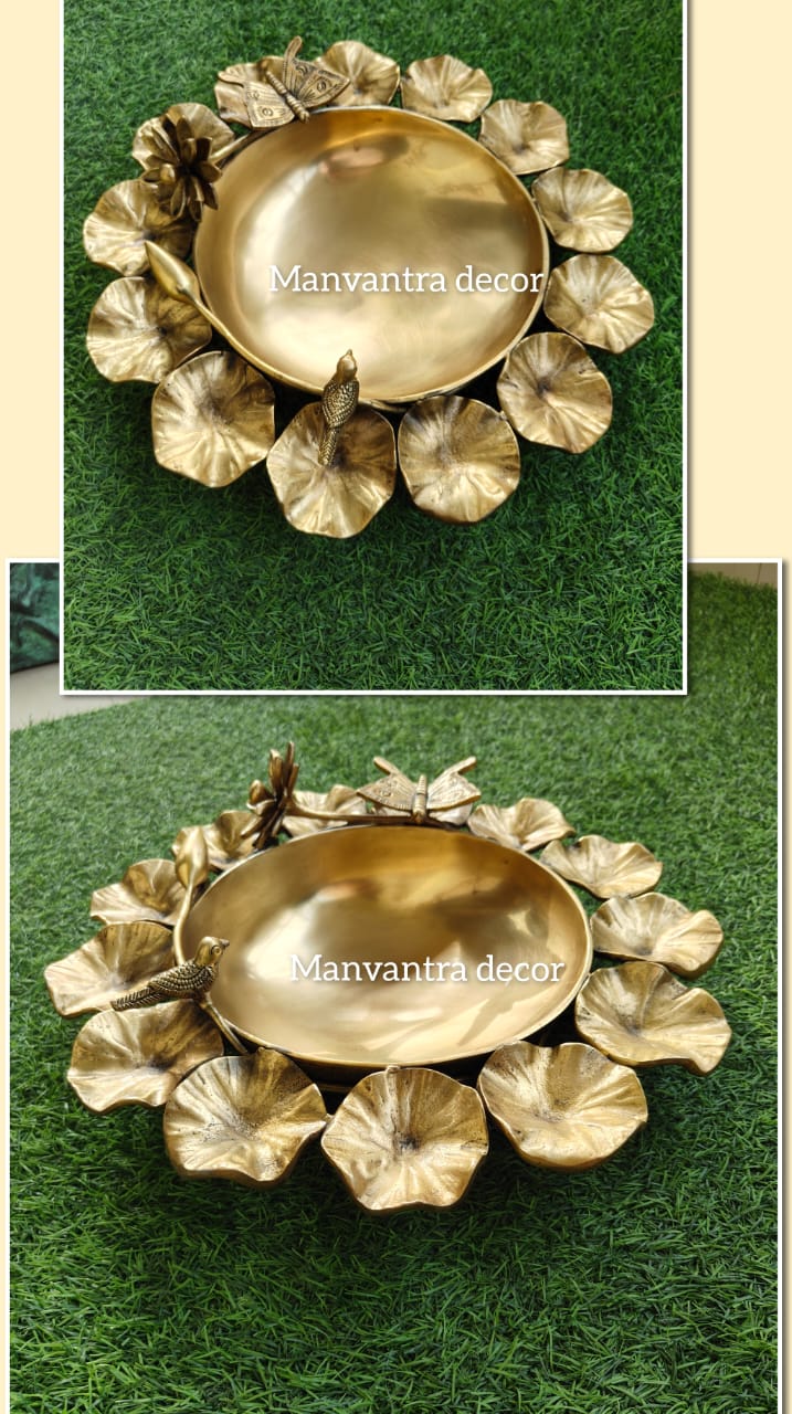 This beautiful urli/ decorative bowl is perfect as a centerpiece for a lounge or center table. Its inclined design enhances visibility of the intricate details, like the floral petals, bird, and butterfly, making it a focal point in any room.